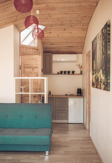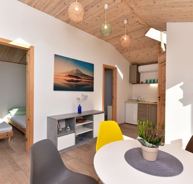 2 miegamieji ir bendra erdvė su sofa-lova, mini virtuvėle su visais įrankiais, šaldytuvu bei kaitlente