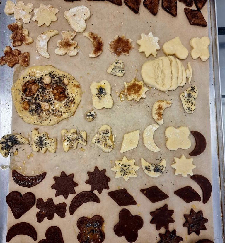 Taip pat kepyklėlėje rengiame šakočių kepimo edukacijas, kurių metu yra pasakojama šakočių kepimo istorija, geriama žolelių arbata, minkant sausainių tešlą, stebimas šakočio kepimo procesas.